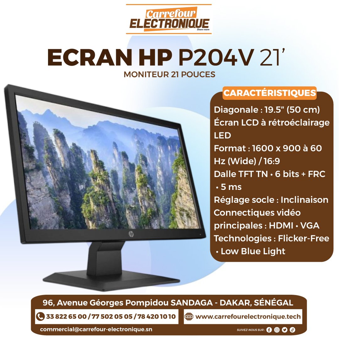 Moniteur HP 21′ pouces Diagonale : 19.5″ (50 cm) Écran LCD à rétroéclairage LED Format : 1600 x 900 à 60 Hz (Wide) / 16:9 Dalle TFT TN • 6 bits + FRC • 5 ms Réglage socle : Inclinaison Connectiques vidéo principales : HDMI • VGA Technologies : Flicker-Free • Low Blue Light