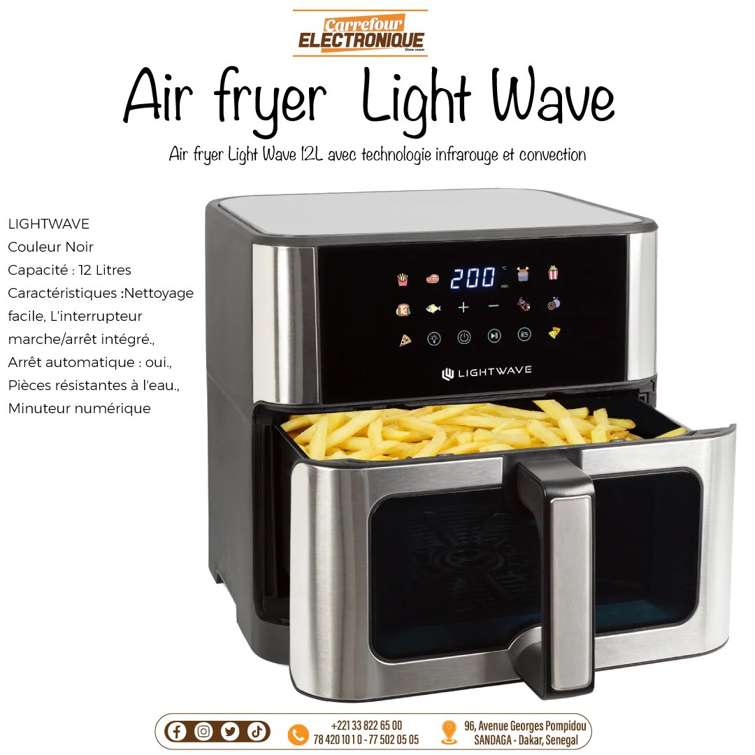 Brand Light Wave Color Black Product Dimensions 34 x 37 x 29 cm; 6.01 kg Capacity 12 Liters Power / Wattage 1.7E+3 Voltage 240 Volts Material Plastic Special Features Timer, Smart Touch Control Panel, 8 Preset Cooking Programs, Oil-Free Cooking Technology Item Weight 6.01 Kilograms
